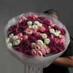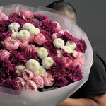 Ce bouquet rond, luxueux et surdimensionné, est un mélange saisissant de couleurs riches et passionnées et d'une douce romance. Il présente une composition dense et abondante de: • Chrysanthèmes (mums) d'un bordeaux profond et magenta comme fleur dominante pour la richesse et la profondeur • Délicates roses de jardin rose pâle et roses spray pour une touche douce et féminine • Chrysanthèmes blancs éclatants parsemés dans l'ensemble pour créer un beau contraste et de la luminosité Les fleurs sont habilement mélangées pour former une grande forme de dôme arrondie, le feuillage vert luxuriant apparaissant pour apporter une texture naturelle. L'ensemble du bouquet est élégamment enveloppé de couches de papier blanc translucide et de papier rose poudré, fini par des rubans rose pâle qui ajoutent un détail subtil et élégant.