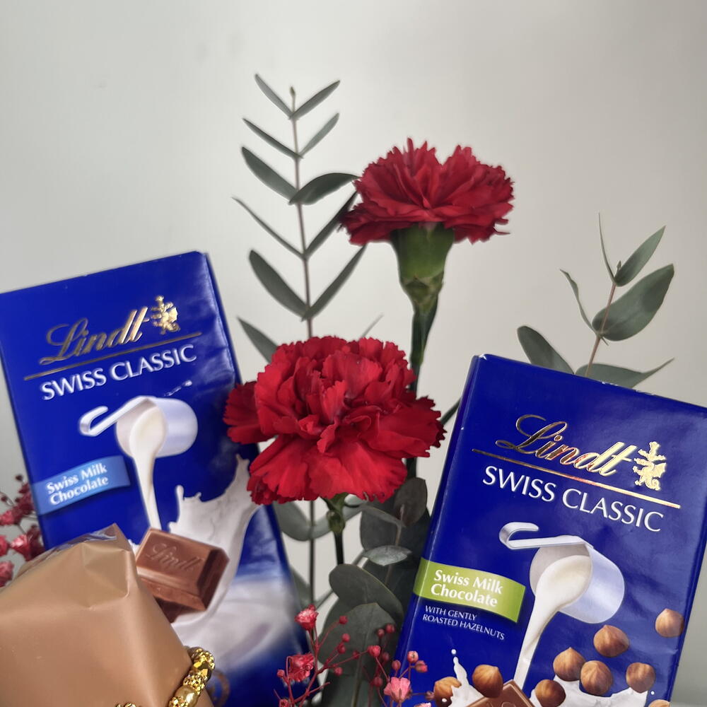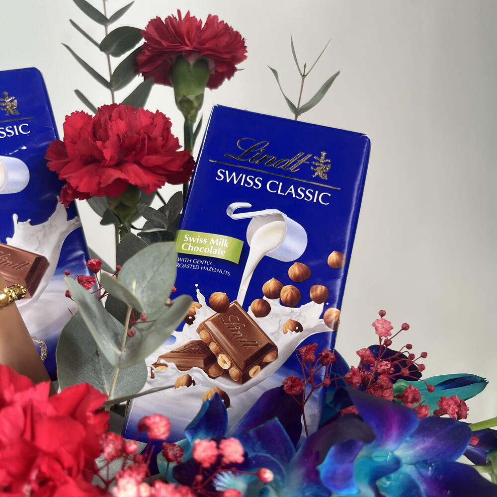 œillet rouge - 3 pce boîte rose - 1 pce eucalyptus leaves - 2 pce orchidée bleue - 1 pce bâton de plâtre - 1 pce tablette de chocolat au lait lindt swiss classic (100 g) - 2 pce
