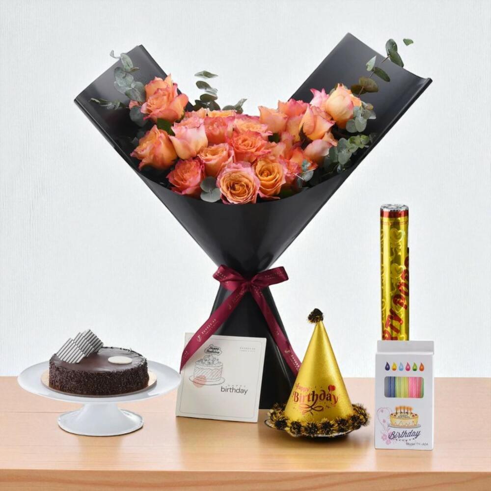 chapeau d'anniversaire doré - 1 pce carte de vœux d'anniversaire - 1 pce roses pêche-orange - 18 pce gâteau au chocolat 1/2 kg - 1 pce popper d'anniversaire - 1 pce boîte de bougies d'anniversaire colorées - 1 pce