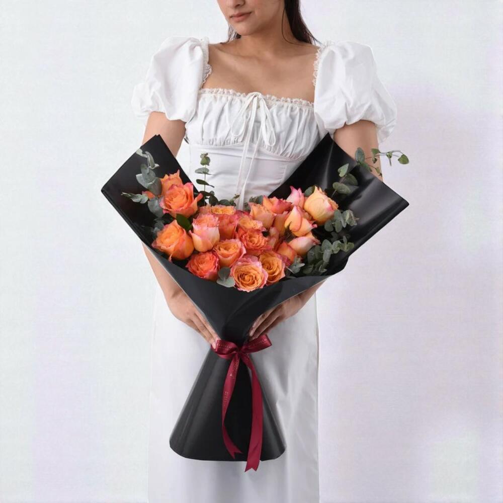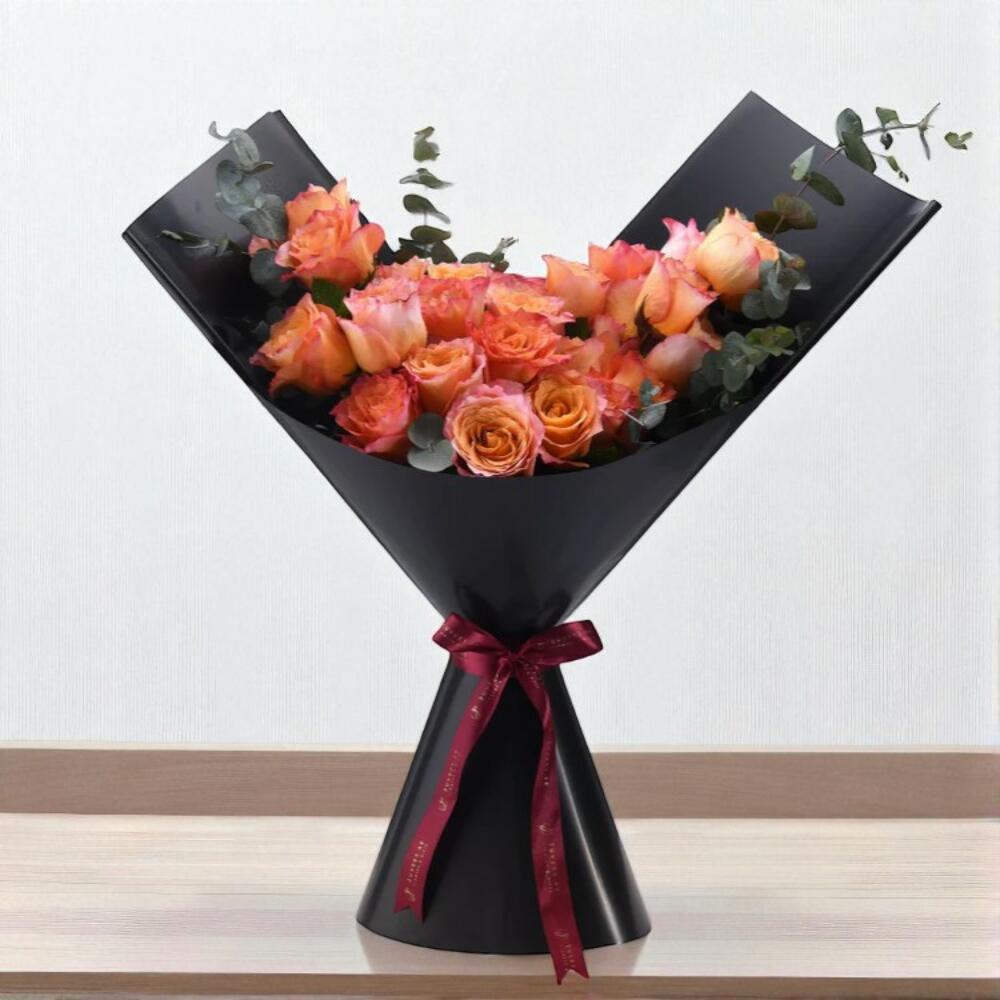 Offrez un anniversaire inoubliable avec le Coffret Anniversaire Royal Sunset, un coffret luxueux et festif comprenant un bouquet de roses aux tons pêche éclatants, un délicieux gâteau au chocolat et tous les essentiels pour une célébration joyeuse. Débordant de nuances vibrantes de pêche et de corail, ces roses sont joliment arrangées avec de l'eucalyptus frais et emballées à la main dans un élégant papier noir, le tout orné d'un élégant ruban bordeaux. Associé à un riche gâteau au chocolat d'un demi-kilo, un chapeau de fête doré, une bougie d'anniversaire, un ensemble de bougies et une carte de vœux, ce coffret tout-en-un est parfait pour créer des souvenirs d'anniversaire magiques. Conseils d'entretien Dès réception du bouquet, placez-le dans de l'eau propre ou conservez-le dans sa mousse florale (le cas échéant). Taillez les tiges à 45° si vous le placez dans un vase. Renouvelez l'eau tous les 1 à 2 jours et conservez les fleurs à l'abri de la lumière directe du soleil et des courants d'air. Conservez le gâteau au réfrigérateur jusqu'au moment de servir. Gardez les accessoires de fête hors de portée des flammes nues et des jeunes enfants.