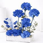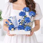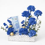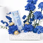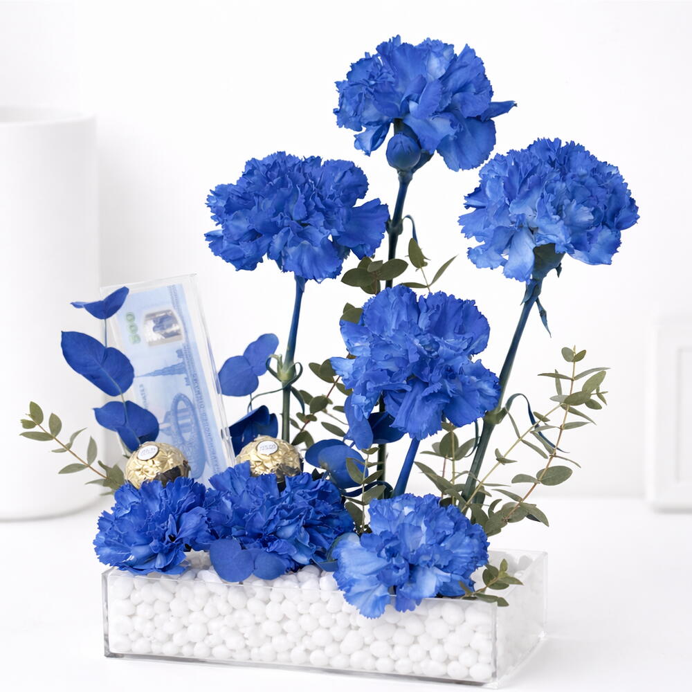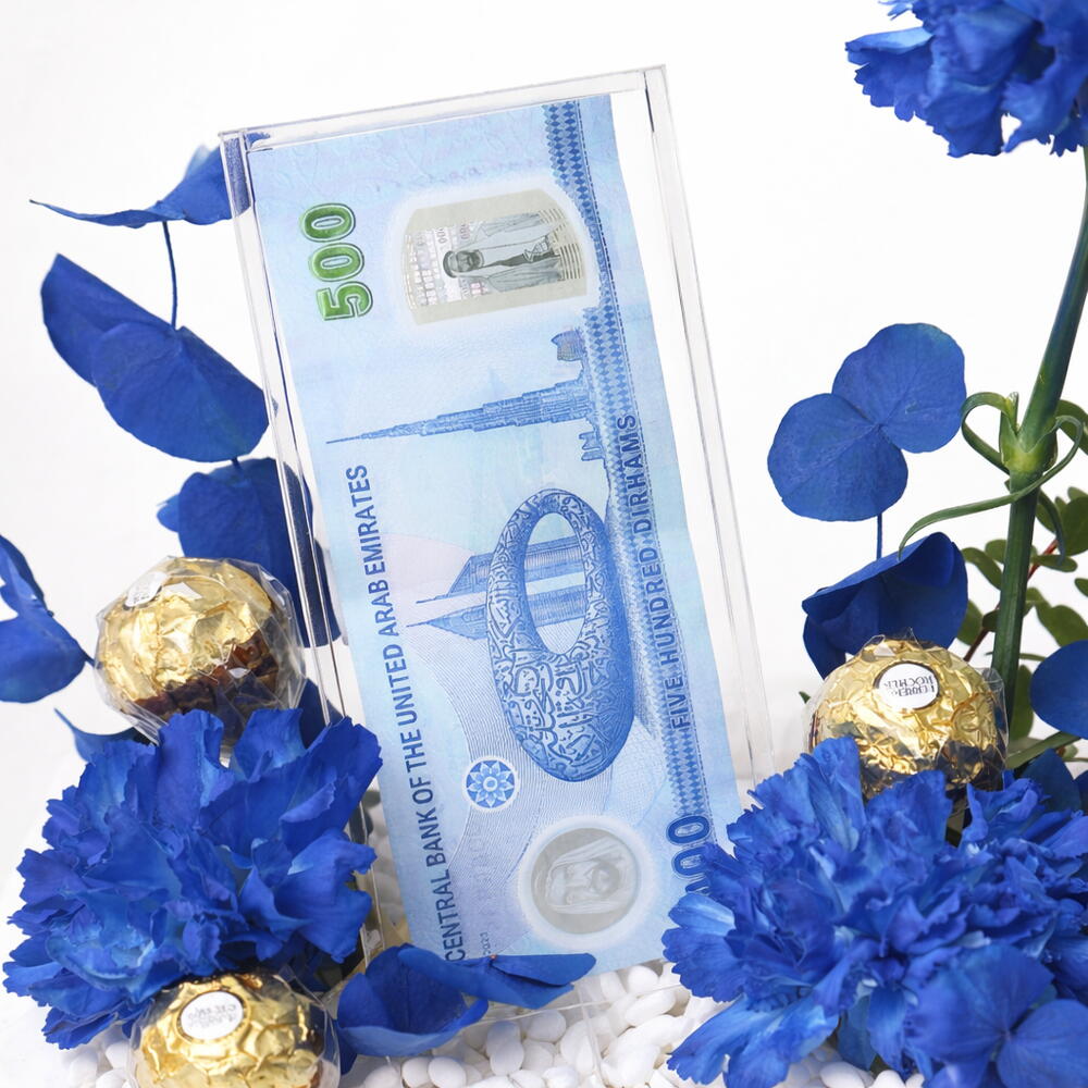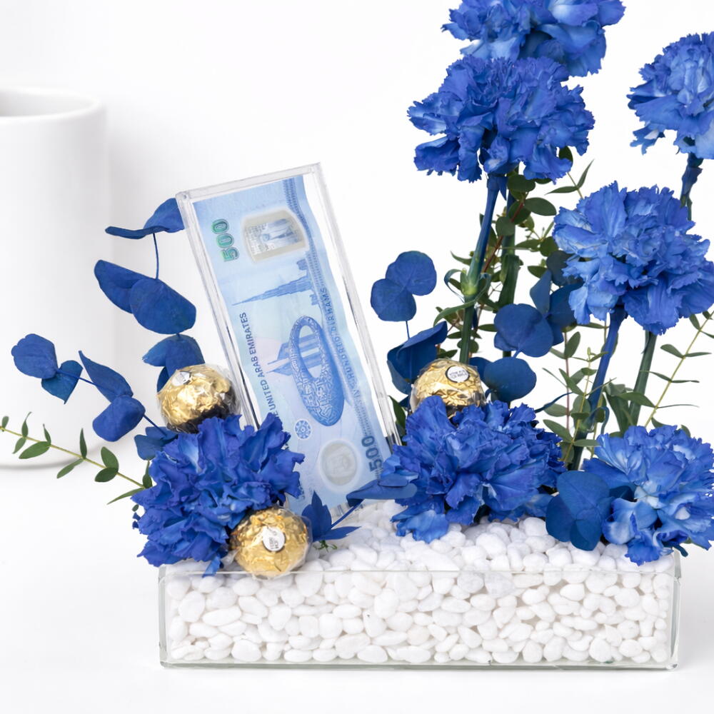 7 œillets bleus teints haut de gamme – fleurs riches et vibrantes symbolisant l'élégance et la distinction Présentation d'un billet de 500 dirhams – présenté avec style dans un plateau en acrylique élégant et épuré 3 chocolats Ferrero Rocher – une touche d'indulgence avec le luxe doré emblématique Design moderne du plateau en acrylique – base épurée et contemporaine pour un aspect raffiné Pierres décoratives blanches – renforcent la texture et la sophistication visuelle Accents de feuillage vert frais – apportent un équilibre naturel et de la fraîcheur Attrait cadeau de luxe – parfait pour anniversaires, célébrations et occasions haut de gamme à Dubaï Élégant, prêt à impressionner – une pièce maîtresse alliant fleurs, cadeaux et design moderne.