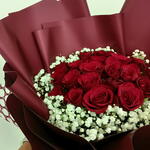 Un bouquet classique et romantique, lié à la main, présentant une grappe éclatante de roses rouges veloutées nichée dans un nuage délicat de gypsophiles blanches. La composition est élégamment enveloppée dans un papier mat couleur rubis de haute qualité, avec une couche extérieure en maille texturée, créant un aspect monochrome audacieux qui rayonne de passion et de beauté intemporelle.