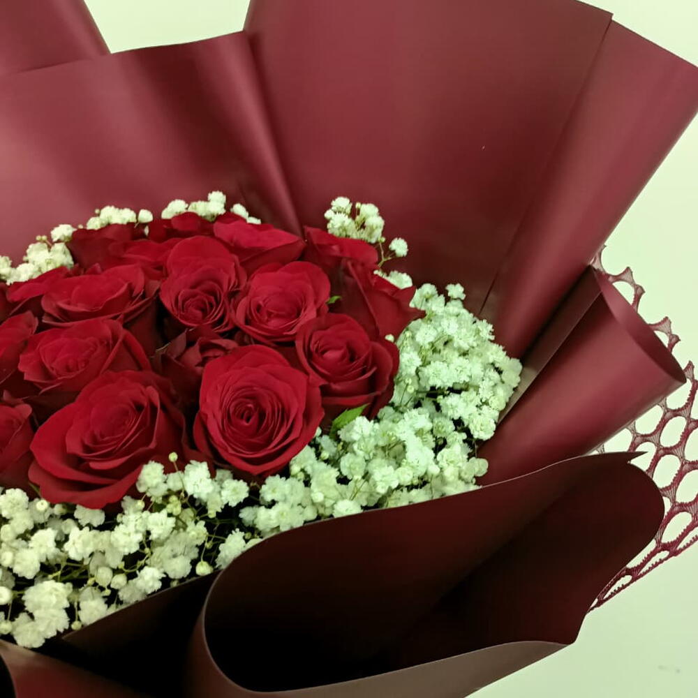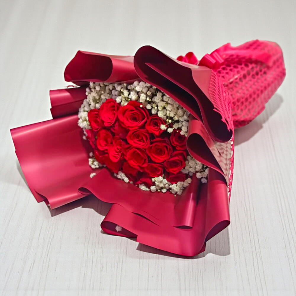 Un bouquet classique et romantique, lié à la main, présentant une grappe éclatante de roses rouges veloutées nichée dans un nuage délicat de gypsophiles blanches. La composition est élégamment enveloppée dans un papier mat couleur rubis de haute qualité, avec une couche extérieure en maille texturée, créant un aspect monochrome audacieux qui rayonne de passion et de beauté intemporelle.