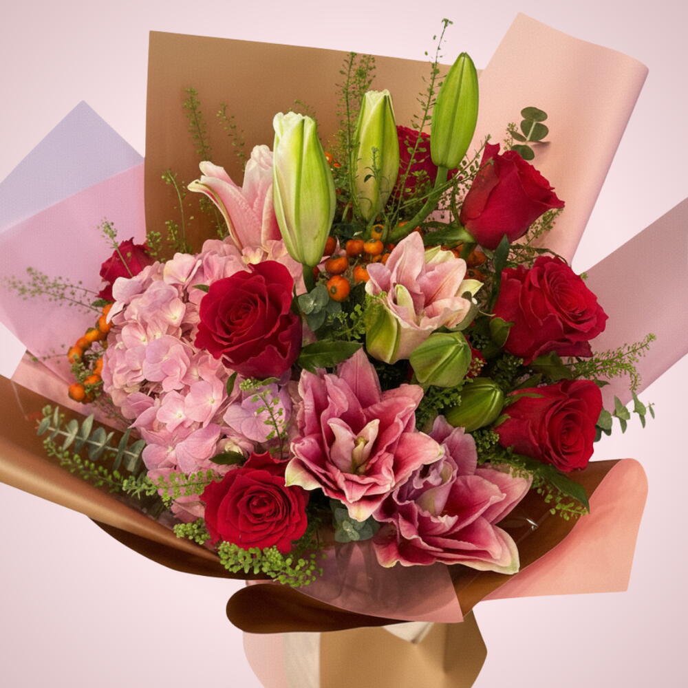 lys rose - 2 pce feuilles vertes - 2 pce rose rouge en tige - 10 pce tige d'hortensia rose - 1 pce eucalyptus - 3 pce