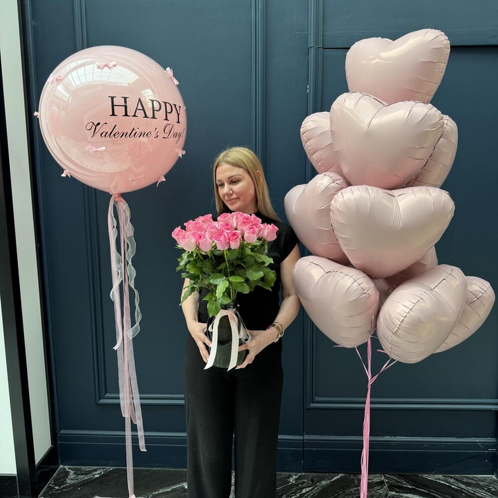 Composition: pink roses - 31, vase - 1, balloon - 11 Sizes: WIDTH - 30CM; HEIGHT - 55CM; LENGTH - 55CM; (including packaging) Размер: 30 x 55 x 55 см