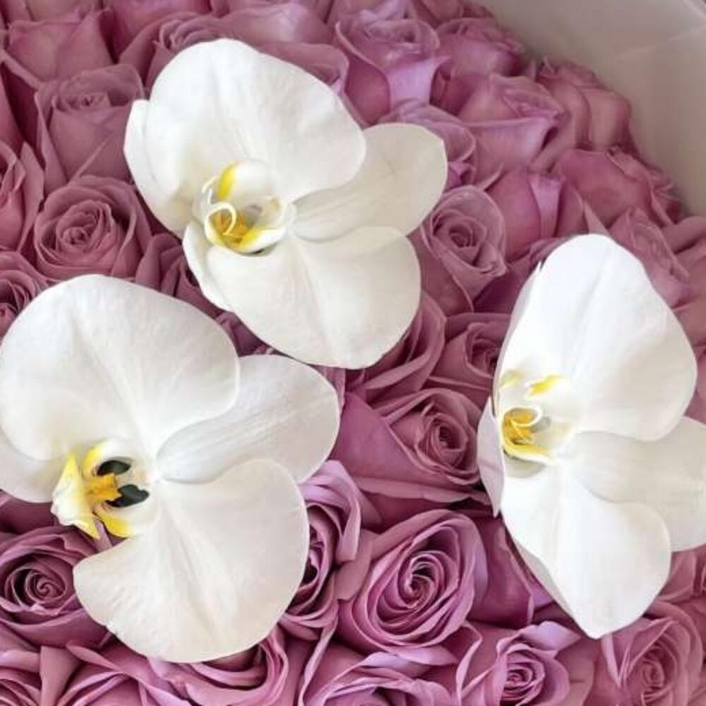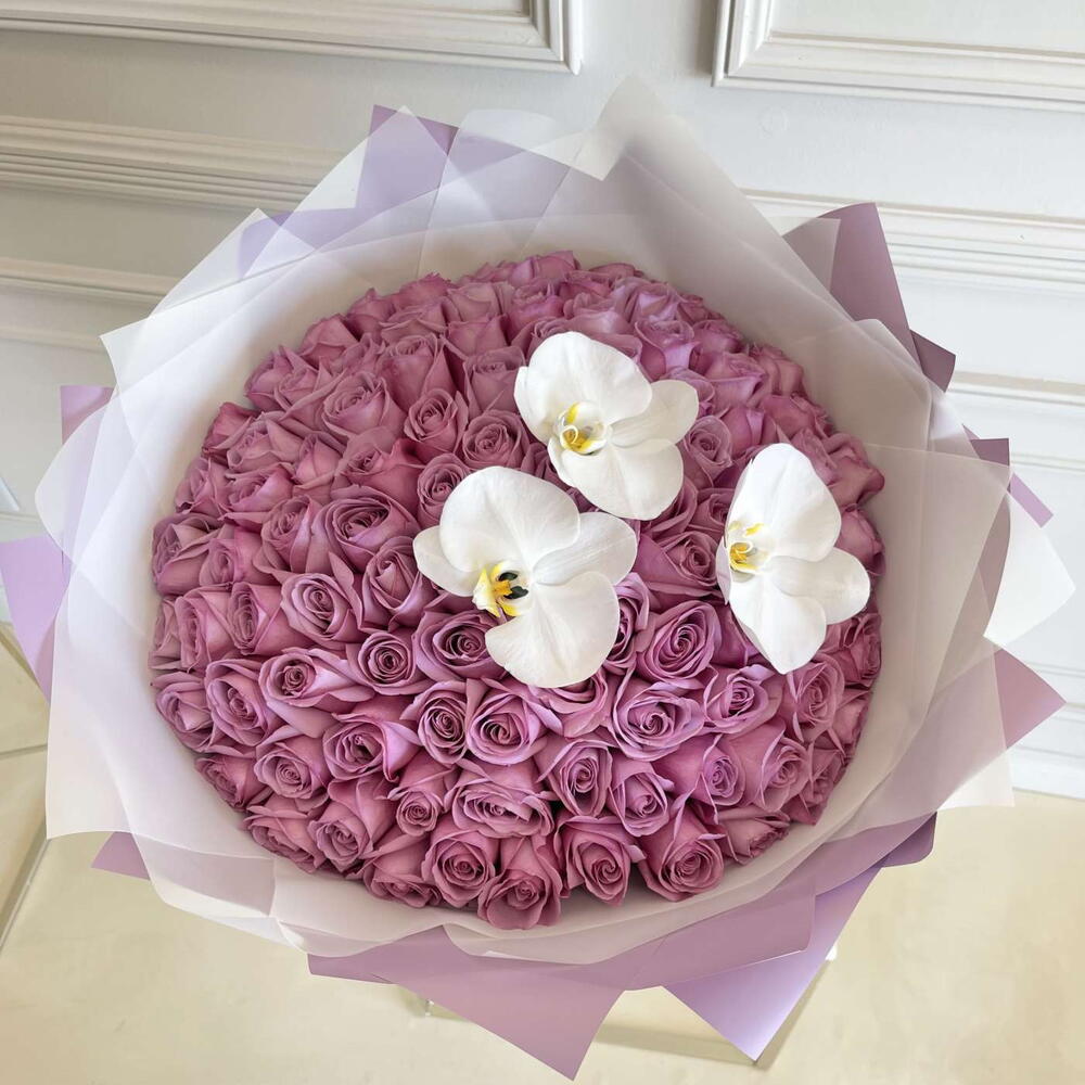 Nuances d'amour _ Bouquet de 99 roses violettes luxueuses avec orchidée blanche pour un anniversaire ou une fête d'anniversaire