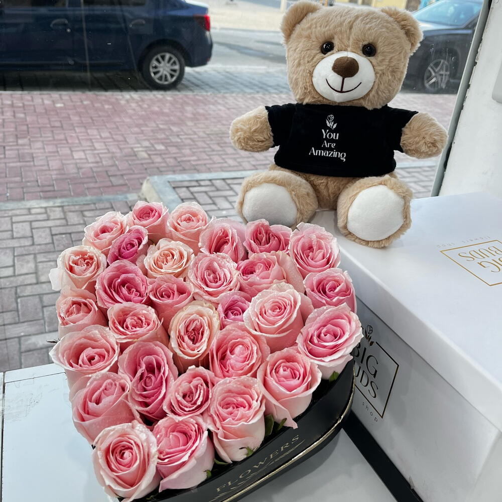 Ours en peluche - 1 pce boîte noire en forme de cœur - 1 pce roses roses. - 25 pce