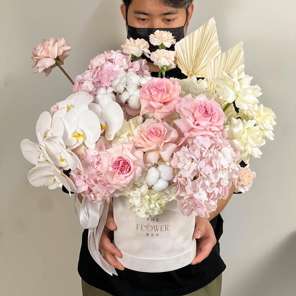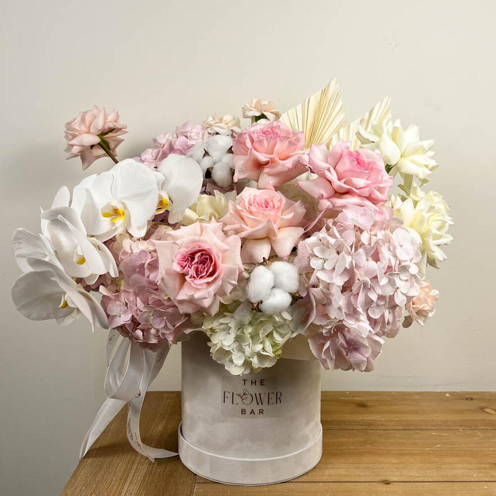 Une grande boîte en velours blanc avec ses hortensias roses et blancs, ses roses OHara blanches et roses, et une branche d'orchidée est une symphonie captivante de couleurs, de textures et de parfums, qui encapsule l'essence du raffinement et du charme.
