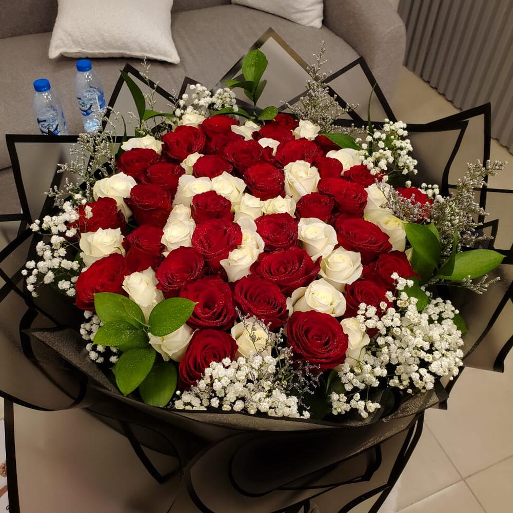 Gypsophila - 10 pce emballage noir - 1 pce red roses - 25 pce roses blanches - 25 pce