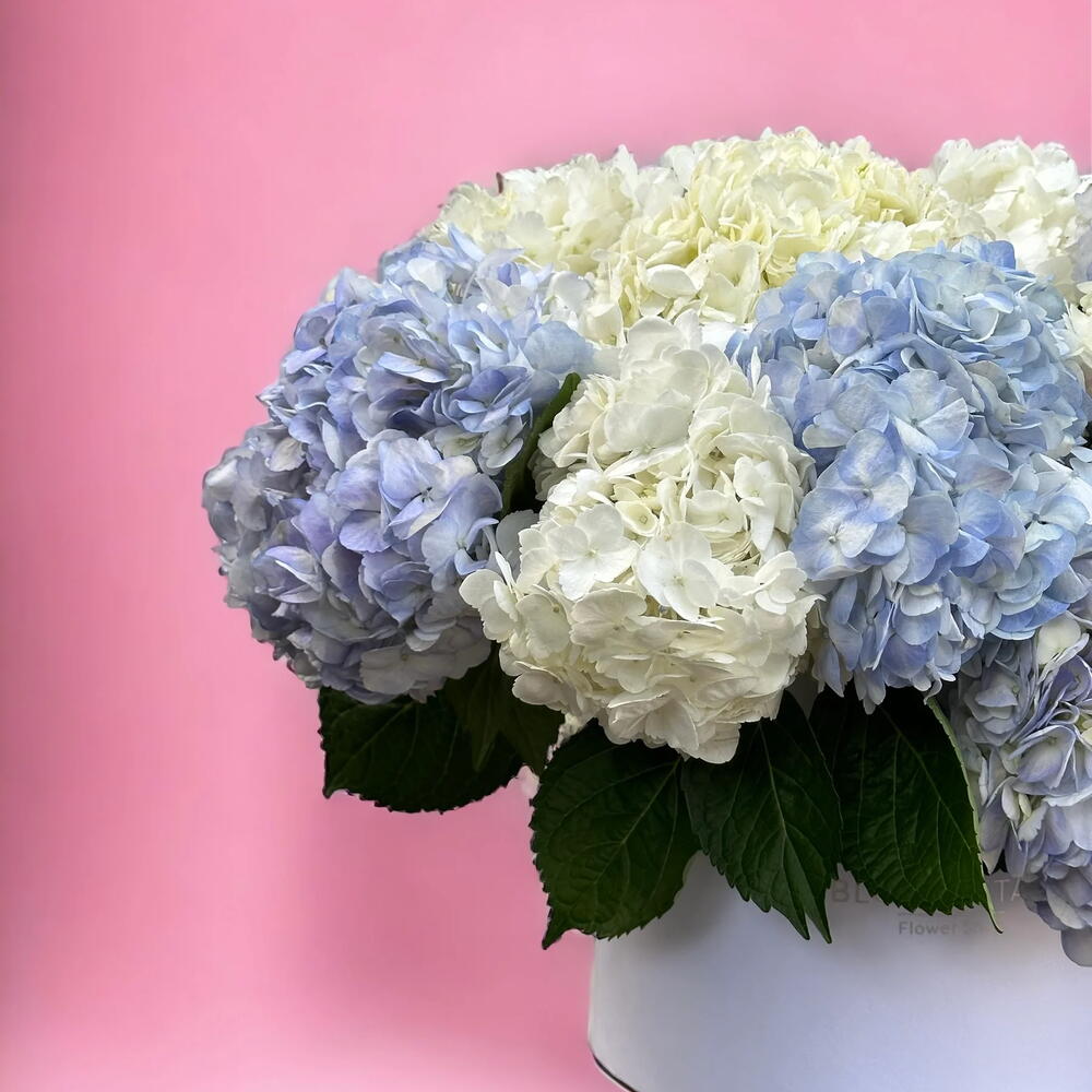 Découvrez la beauté de notre ravissant assortiment de 12 hortensias bleus et blancs, élégamment disposés dans notre boîte blanche Blush sophistiquée.