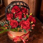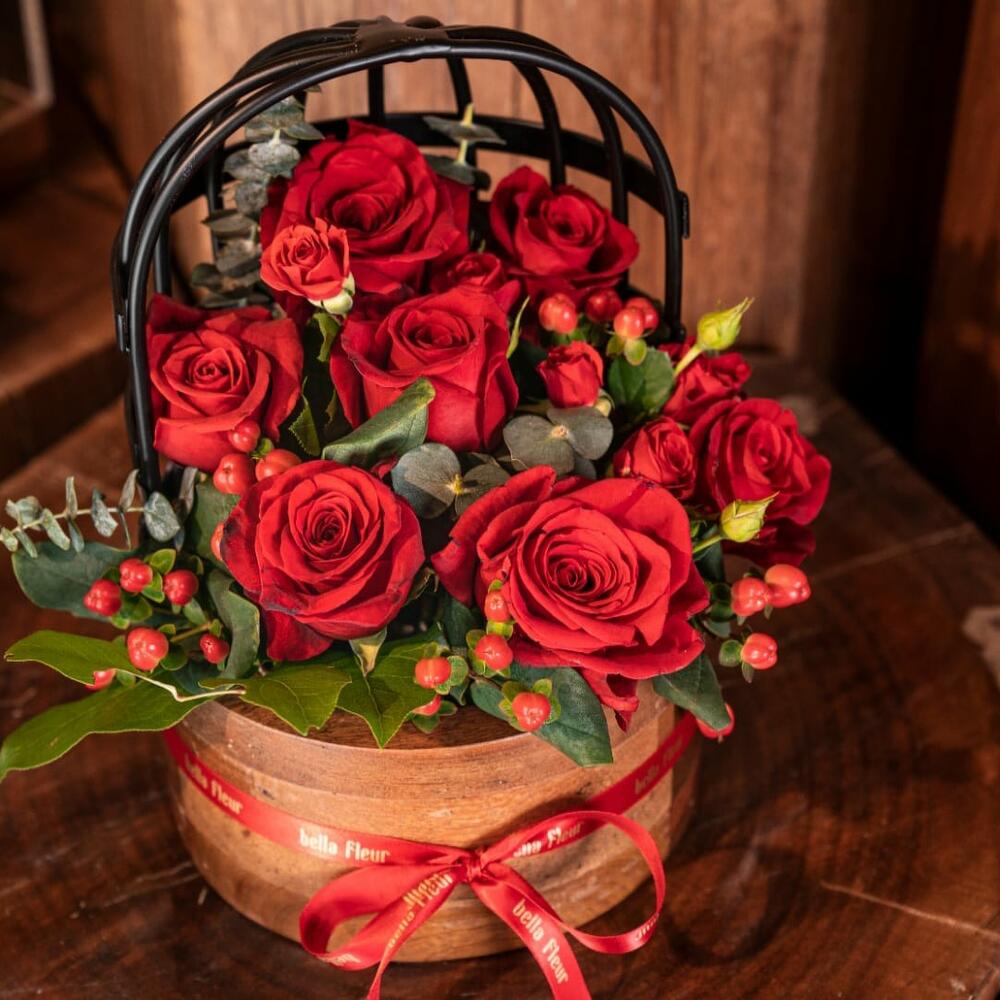 Greenery - 1 pce hypericum - 5 pce red roses - 7 pce spray roses - 5 pce petite cage à oiseaux Lakewood - 1 pce