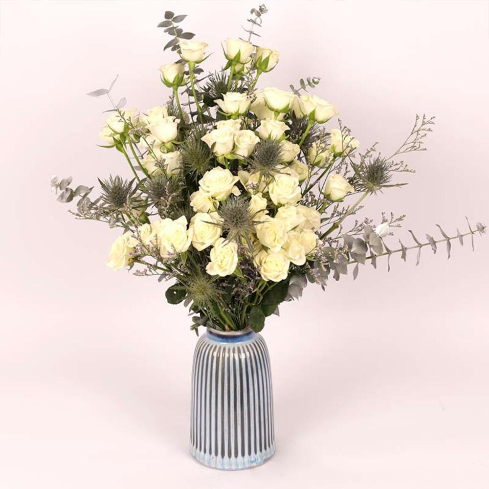 11 tiges de mini-roses blanches, 3 tiges d'éryngiums, 3 tiges d'eucalyptus Baby Blue pulvérisé argenté, 1 tige de limonium blanc, Préparé dans un vase premium en céramique/verre - 11.5x20cm.