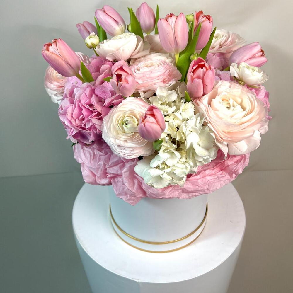 hydrangea pink - 3 pce renoncule rose - 10 pce hortensia blanc - 2 pce tulipe rose - 10 pce