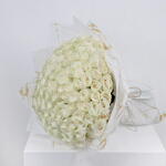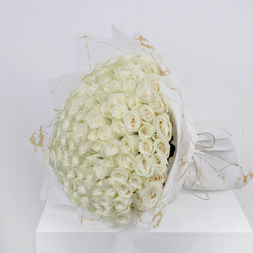 Bouquet de fleurs de neige, offrez 100 roses blanches et laissez la blancheur de votre cœur parler de ce qui est en vous. Soyez sûr que la pureté de votre cœur apportera le bonheur à travers les 100 roses blanches avec l'emballage blanc et laissez la merveilleuse neige parler pour vous.