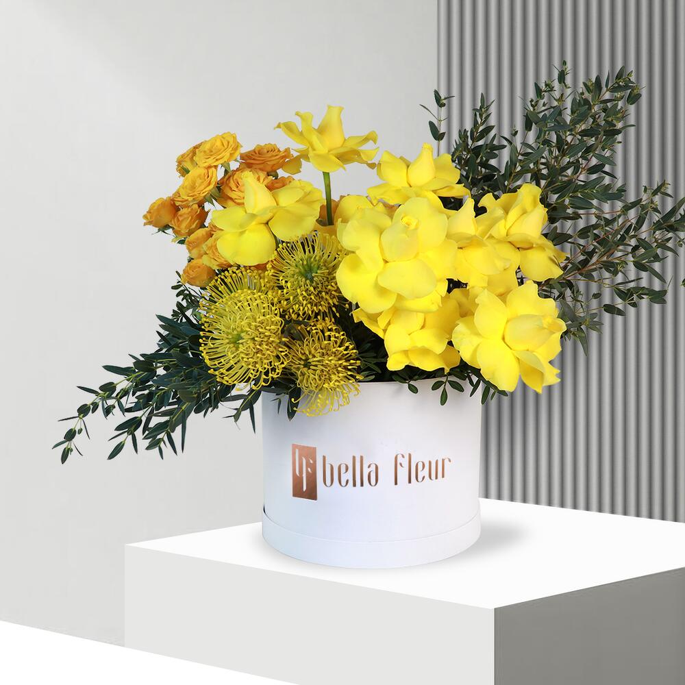 Grande boîte Bella de fleurs mixtes et ensoleillées.