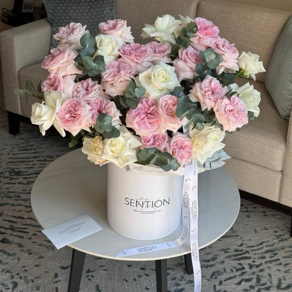 Ces charmantes fleurs en boîte sont une solution élégante et stylée pour toute occasion. L'arrangement comprend 20 roses Ohara parfumées d'un rose délicat, 10 roses françaises d'un blanc immaculé et 10 brins d'eucalyptus frais. Les couleurs et les textures harmonieuses en font un arrangement-cadeau idéal, qui surprendra et ravira à coup sûr tout destinataire.
