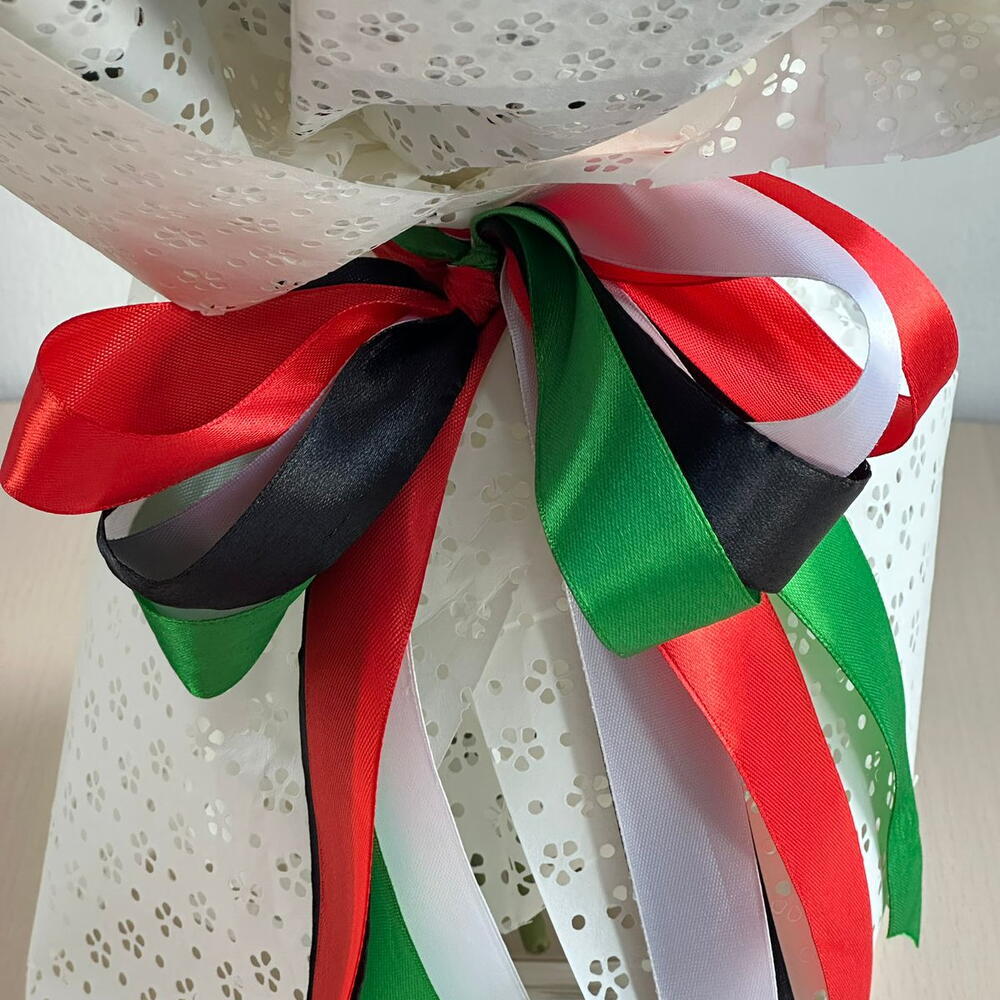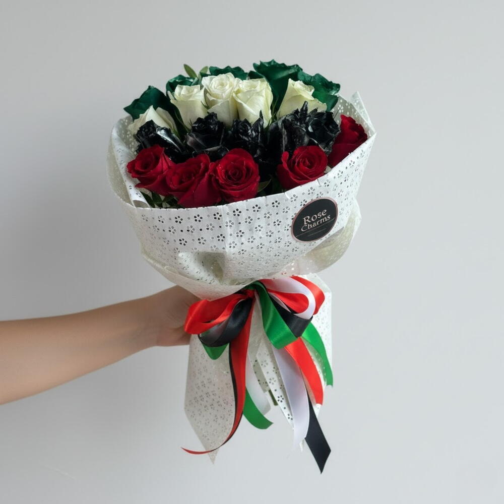 Célébrez la Fête nationale des Émirats arabes unis avec le bouquet Esprit des Émirats, composé de 20 roses éclatantes aux couleurs emblématiques du drapeau des Émirats arabes unis. Enveloppé élégamment dans un blanc immaculé, ce bouquet est un symbole saisissant de fierté nationale et d'unité. Parfait pour honorer l'esprit et le patrimoine des Émirats arabes unis de manière significative et belle.