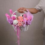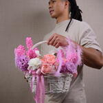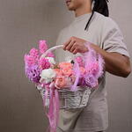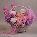 Basket - 1 pce carnation - 6 pce feather - 3 pce juliette - 2 pce jacinthe - 7 pce eustoma 3 - 3 pce