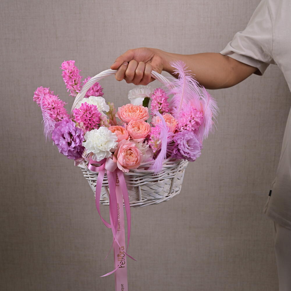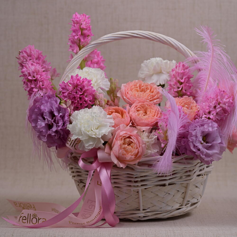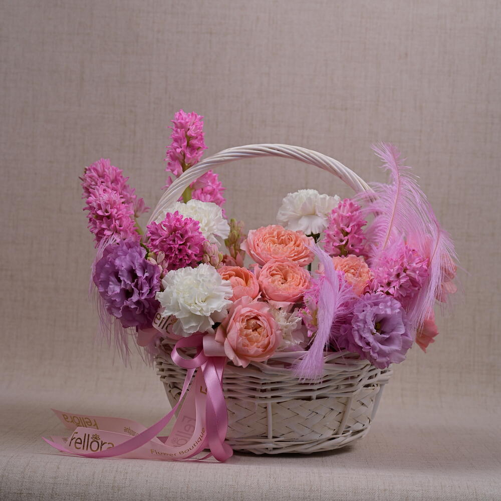 Basket - 1 pce carnation - 6 pce feather - 3 pce juliette - 2 pce jacinthe - 7 pce eustoma 3 - 3 pce