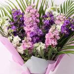 5 Matthiola blanches 5 Matthiola roses 5 Matthiola violettes Feuilles de palviforia et de palmier Emballage soigné et ruban