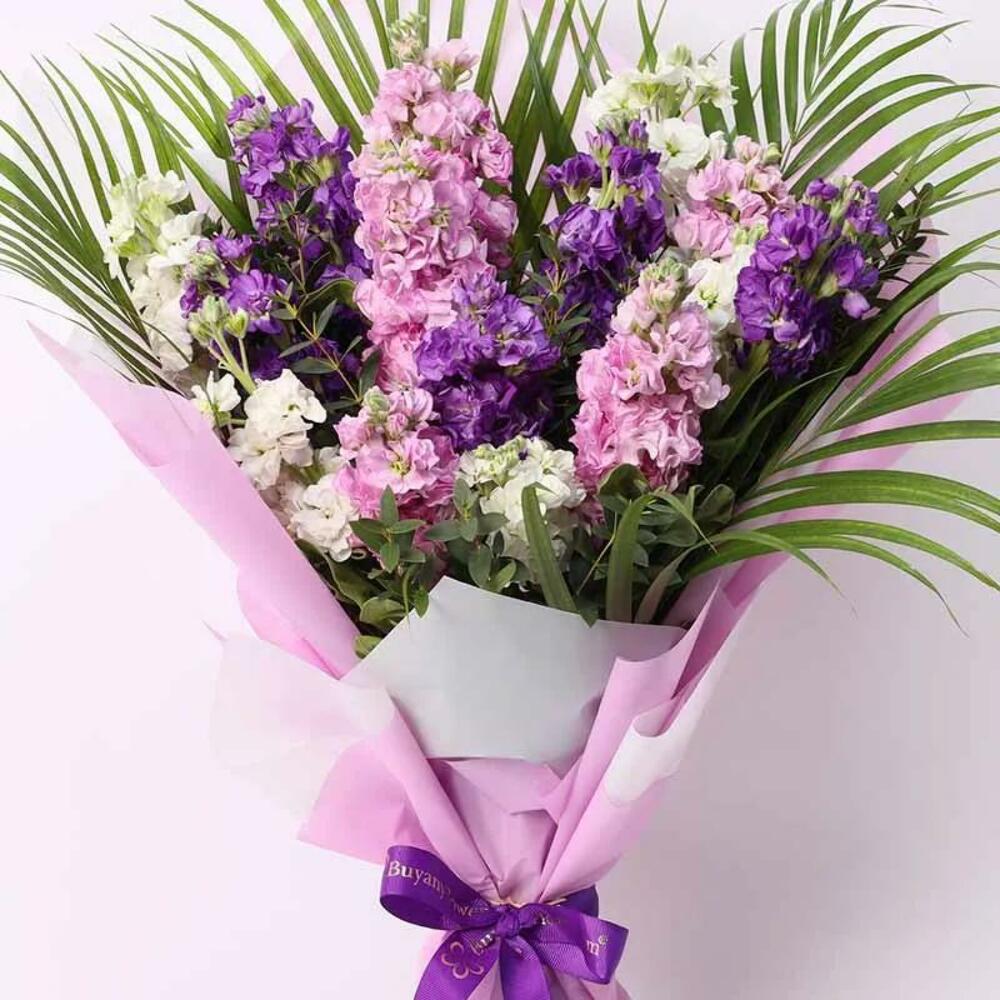 5 Matthiola blanches 5 Matthiola roses 5 Matthiola violettes Feuilles de palviforia et de palmier Emballage soigné et ruban