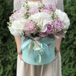 Composition : Hortensia - 5, Pivoine rose - 9, Chamelacium - 3, boîte - 1, ruban - 2 Dimensions : LARGEUR - 30CM; HAUTEUR - 35CM; LONGUEUR - 35CM; (y compris l'emballage) Taille : 30 x 35 x 35 cm