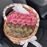 Fraise enrobée de chocolat dans le panier avec des fleurs