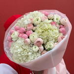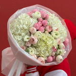Le bouquet Strawberry Whisper est un arrangement doux et onirique qui mêle de délicates nuances de rose poudré, crème et rose pâle en une composition florale harmonieuse. Des hortensias somptueux créent une base douce, semblable à un nuage, tandis que des renoncules aériennes, des roses spray romantiques et des eustomas élégants apportent profondeur, texture et charme raffiné.