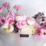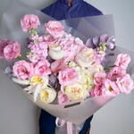Ribbon - 1 pce white hydrangea - 1 pce pink hydrangea - 1 pce rose premium - 6 pce eucalyptus leaves - 3 pce queue de lapin - 6 pce matthiola pourpre - 3 pce décorations - 4 pce