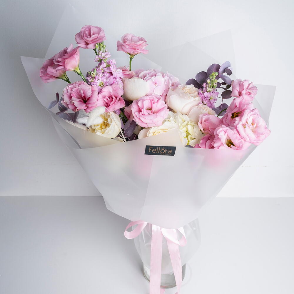 Ribbon - 1 pce white hydrangea - 1 pce pink hydrangea - 1 pce rose premium - 6 pce eucalyptus leaves - 3 pce queue de lapin - 6 pce matthiola pourpre - 3 pce décorations - 4 pce