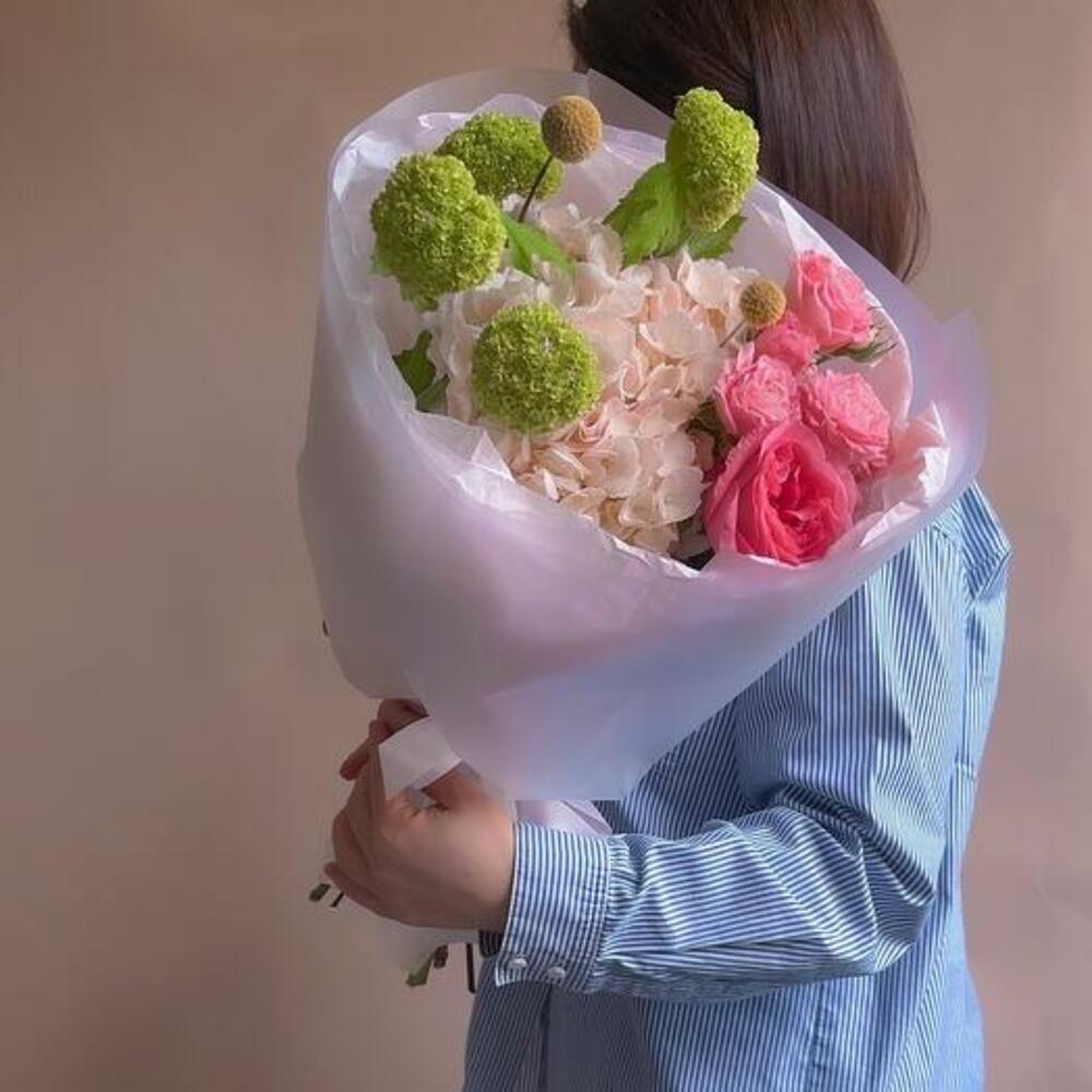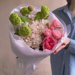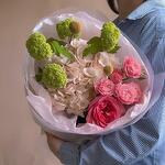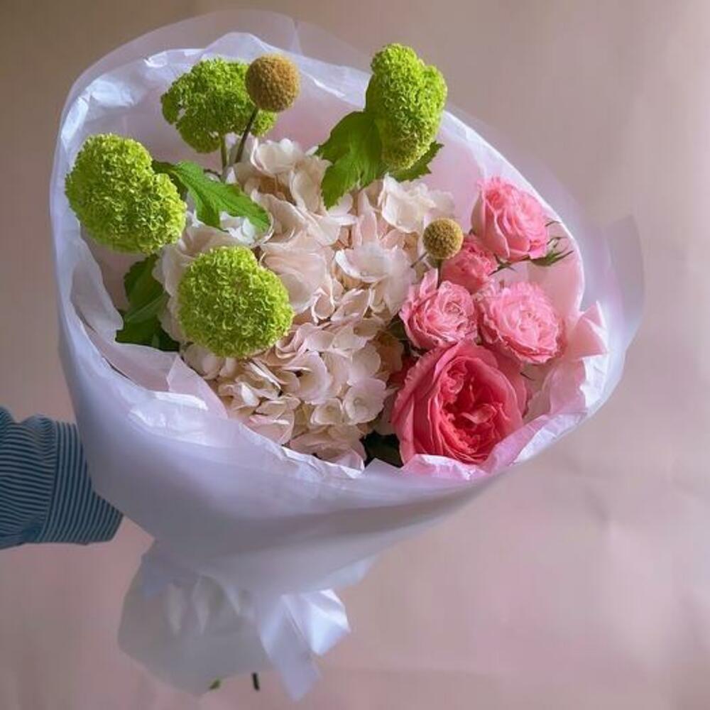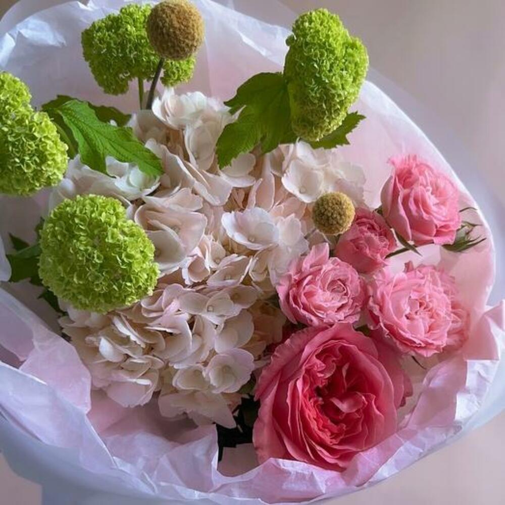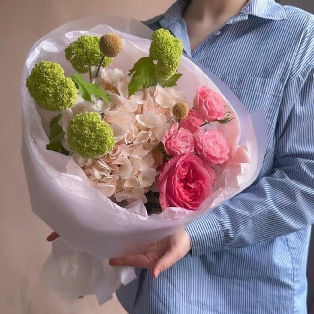 Peony rose - 1 pce Spray rose - 1 pce Hydrangea - 1 pce Viorne - 1 pce packaging - 1 pce craspedia - 2 pce