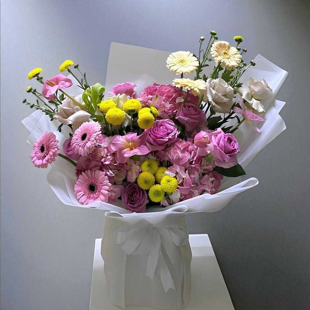 Sun-Kissed Blush est un bouquet vibrant et joyeux, débordant de couleurs et de charme. Composé de craspédias jaunes espiègles, de gérberas délicates et de roses romantiques, cet arrangement est parfait pour égayer la journée de quelqu'un ou célébrer des moments joyeux. Enveloppé dans un élégant papier blanc avec un ruban assorti pour une finition soignée.