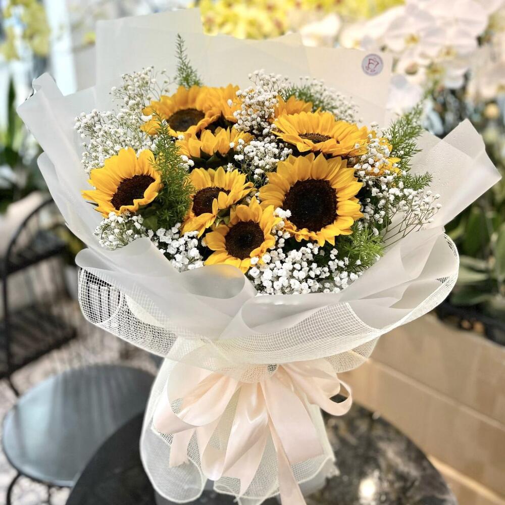 Sunflower - 9 pce Gypsophila - 5 pce Feuilles vertes - 3 pce papier cadeau - 5 pce