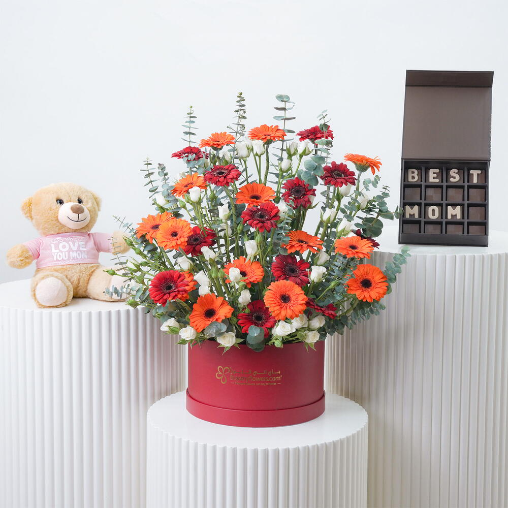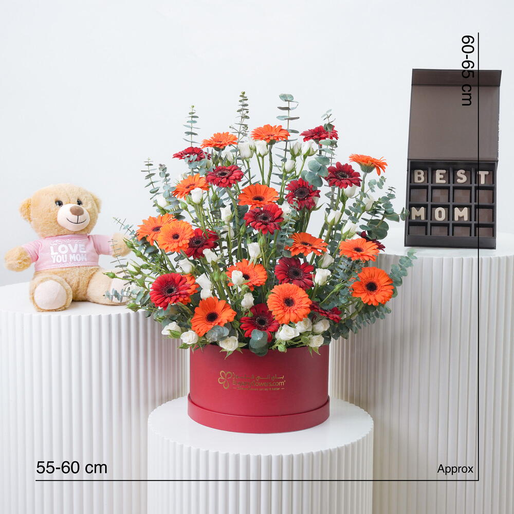 Gérbera rouge - 15 pce gérbera orange - 12 pce tiges d'eucalyptus - 3 pce tiges de mini-roses blanches - 8 pce disposé dans une petite boîte rouge (25 × 15 cm) - 1 pce sweecho premium chocolat 16 pièces pour la meilleure maman - 1 pce je t'aime maman 25 cm peluche - 1 pce