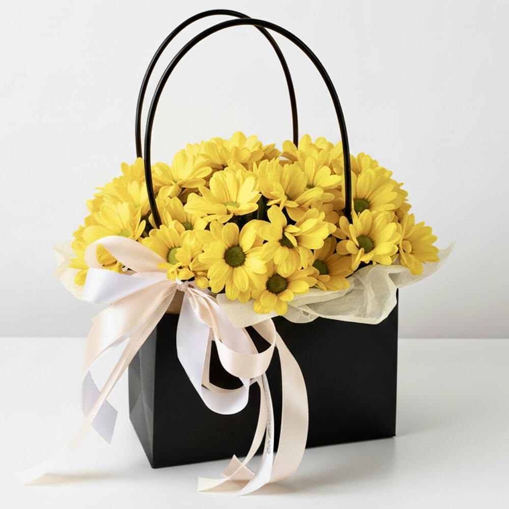 Un bouquet lumineux et réjouissant de 11 chrysanthèmes jaunes présenté dans un sac noir élégant. Le contraste prononcé confère un aspect moderne et saisissant—parfait pour offrir avec joie, pour les célébrations et la décoration.