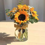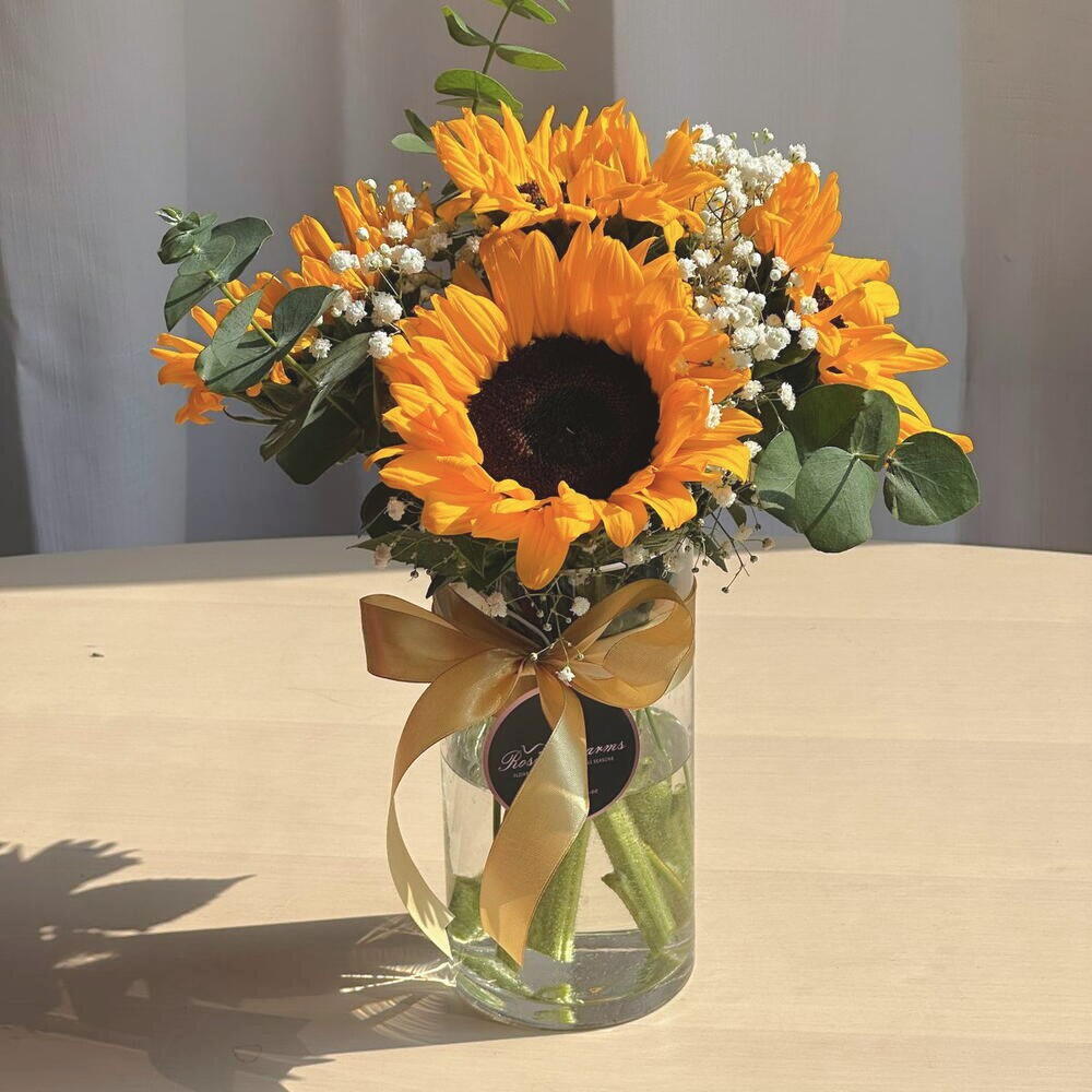 Ribbon - 5 pce Eucalyptus - 2 pce Gypsophila - 4 pce Vase - 1 pce tournesol - 5 pce roses jaunes - 2 pce