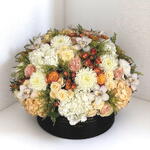 Élégant et chaleureux, cet arrangement luxueux en boîte à chapeau présente une palette riche d'inspiration automnale aux tons ivoire, pêche, caramel et orange doux. Le bouquet associe de grands chrysanthèmes blancs, des hortensias luxuriants, des roses classiques et des roses spray, et d'exotiques orchidées cymbidium. Des touches de solidago et un feuillage texturé apportent contraste et volume, le tout soigneusement composé dans une élégante boîte à chapeau noire. Parfait pour de grandes célébrations, des anniversaires ou une décoration luxueuse, cet ensemble floral apporte chaleur et sophistication à tout espace. Pour le garder frais, vérifiez la mousse florale quotidiennement et ajoutez de l'eau propre au besoin. Exposez-le dans un endroit frais, à l'abri de la lumière directe du soleil ou des sources de chaleur.