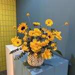 Sunflower - 3 pce Yellow rose - 5 pce chardon - 3 pce craspedia - 2 pce gérbera jaune - 3 pce rose en spray jaune - 3 pce pot blanc fait main - 1 pce