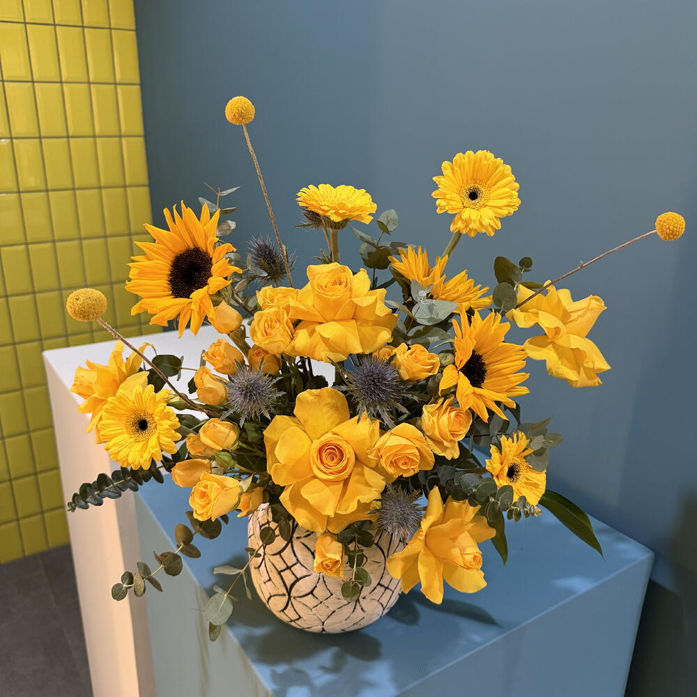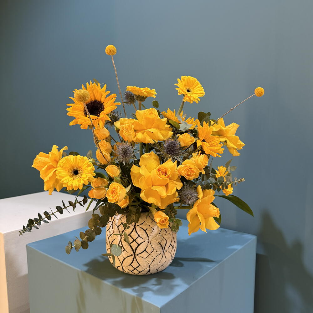 Sunflower - 3 pce Yellow rose - 5 pce chardon - 3 pce craspedia - 2 pce gérbera jaune - 3 pce rose en spray jaune - 3 pce pot blanc fait main - 1 pce