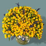 Une composition joyeuse de roses jaunes, symbolisant le soleil, complétée par la touche sereine de lavande, présentée dans un vase sphérique transparent, créant une présentation harmonieuse et réjouissante.