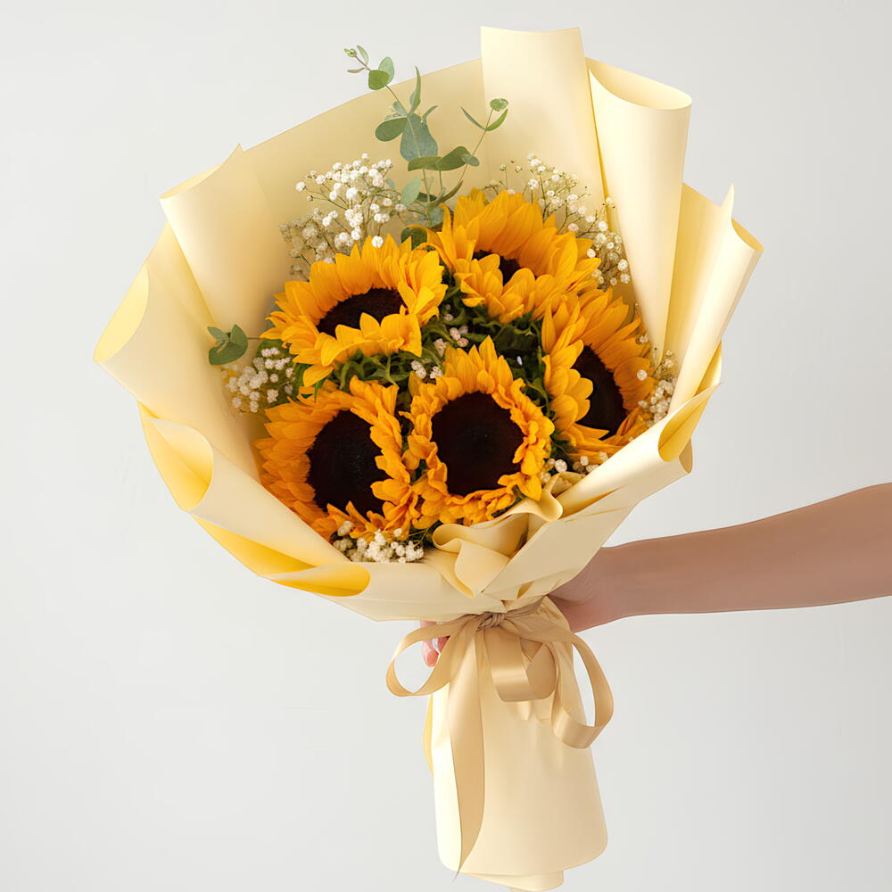Éclatant, joyeux et plein de chaleur. Sunshine Smile présente cinq tournesols vibrants enveloppés dans un papier doux et élégant — conçus pour remonter instantanément le moral. Parfait pour les anniversaires, les félicitations, les moments de remerciement ou tout simplement pour envoyer un peu de soleil. Fleurs pour remonter le moral Fleurs d'anniversaire Fleurs de félicitations Cadeaux de remerciement Bouquets de tournesols Fleurs d'été