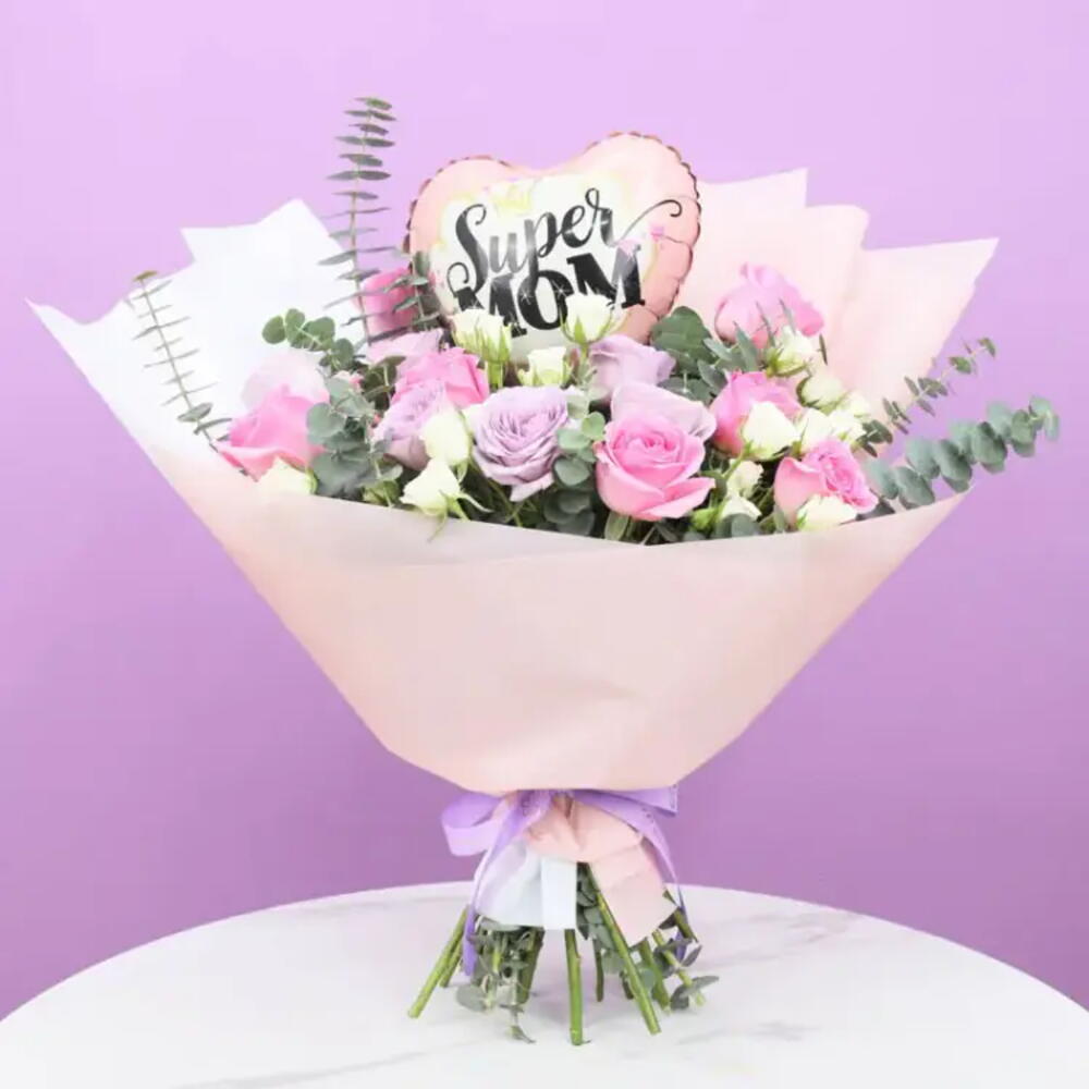 1 Ballon Super Maman de 10 pouces, 8 roses roses, 7 roses violettes, 4 tiges de mini-roses blanches, Feuillage - 7 tiges d'eucalyptus, Enveloppé dans un emballage pastel et blanc, Attaché par un nœud de ruban violet.