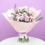 Eucalyptus - 4 pce pink roses - 8 pce roses violettes - 7 pce tiges de mini-roses blanches - 4 pce ballon super maman - 1 pce