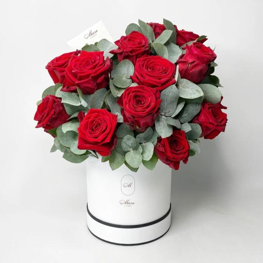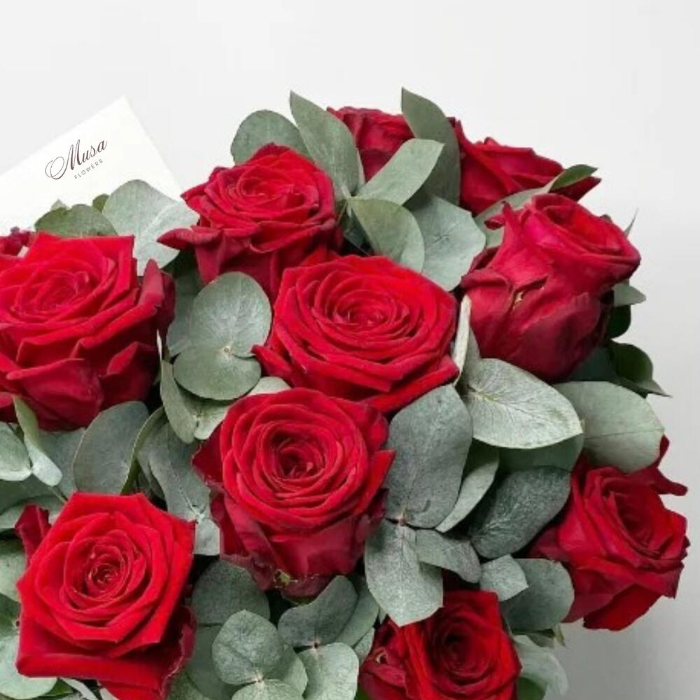 Eucalyptus - 10 pce red roses - 25 pce