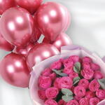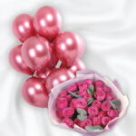 conception d'emballage - 5 pce ribbon satin - 1 pce ballons chromés - 11 pce rose pivoine roses - 15 pce