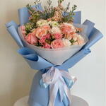 Laissez-vous séduire par Sweet Blue, un bouquet aux teintes pastel oniriques, enveloppé dans un élégant papier bleu et orné d'un ruban délicat. C'est le bouquet d'anniversaire idéal, un choix de premier ordre pour une personne qui apprécie les tons doux et raffinés. Ce bouquet de fleurs fraîches est magnifiquement composé de roses roses, de roses pêche, de roses branchues roses, d'œillets blancs duveteux, de chrysanthèmes blancs pompons, d'une renoncule crème (fleuron jaune) et de délicates touches de saison comme des giroflées pêche et un feuillage léger pour un rendu aérien et haut de gamme. Parfait pour un anniversaire, ce bouquet de roses est également idéal pour exprimer sa flamme, célébrer un anniversaire de mariage ou faire une surprise, ou encore féliciter une personne pour un nouveau départ. Si vous recherchez un bouquet de fleurs variées de qualité supérieure, ce bouquet d'exception est un cadeau remarquable et un incontournable à Dubaï.