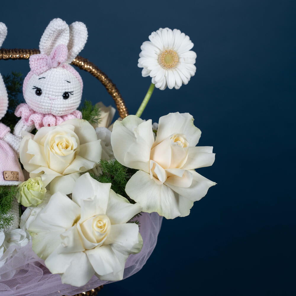 Ours en peluche - 2 pce Eustoma white - 1 pce rose blanche - 5 pce asperge - 1 pce hortensia blanc - 1 pce germini blanc - 4 pce cire blanche - 1 pce organza rose - 1 pce