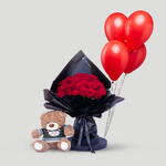 Un coffret plein de tendresse comprenant un bouquet de 25 roses rouges, un adorable ours en peluche, un ballon assorti. Cette combinaison parfaite d'amour, de douceur et de chaleur en fait un cadeau inoubliable.