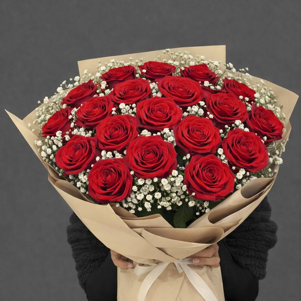 gypsophilia blanche - 10 pce red roses - 30 pce