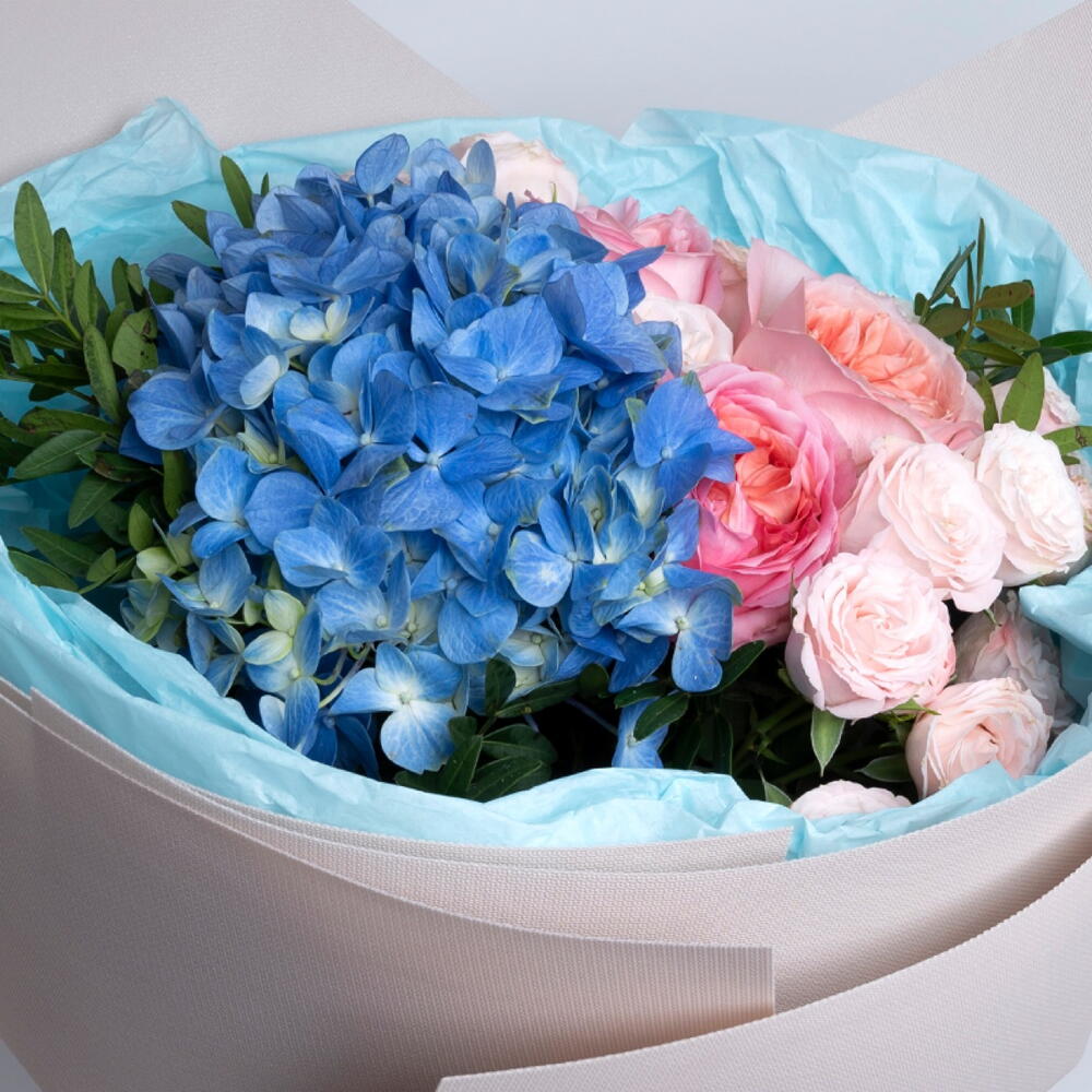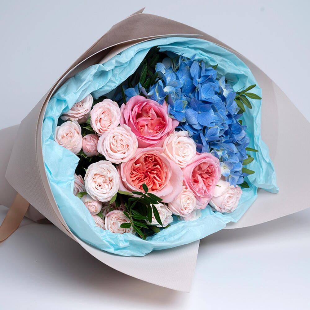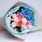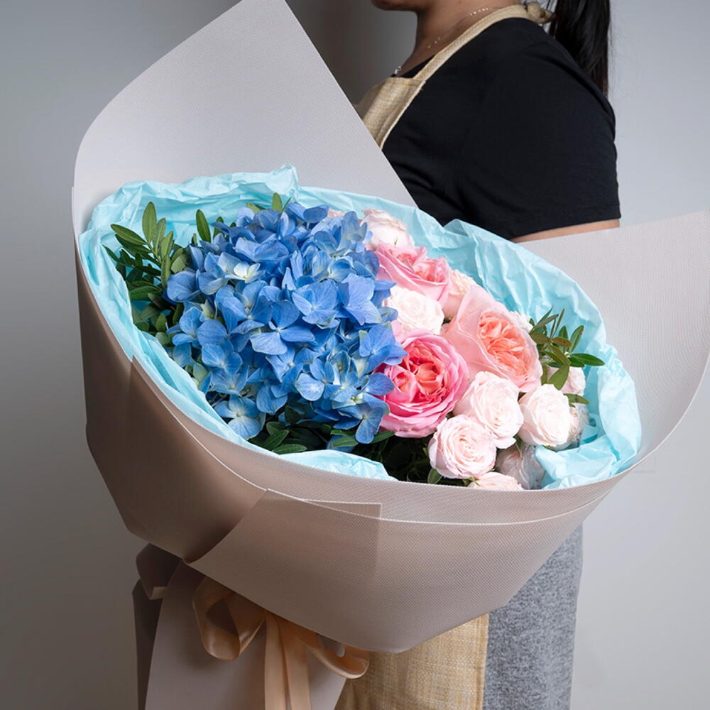 Pistachio - 3 pce ribbon satin - 1 pce hortensia bleu - 1 pce wrapping paper - 5 pce spray de rose bombastique - 5 pce rose expression de jardin rose - 3 pce